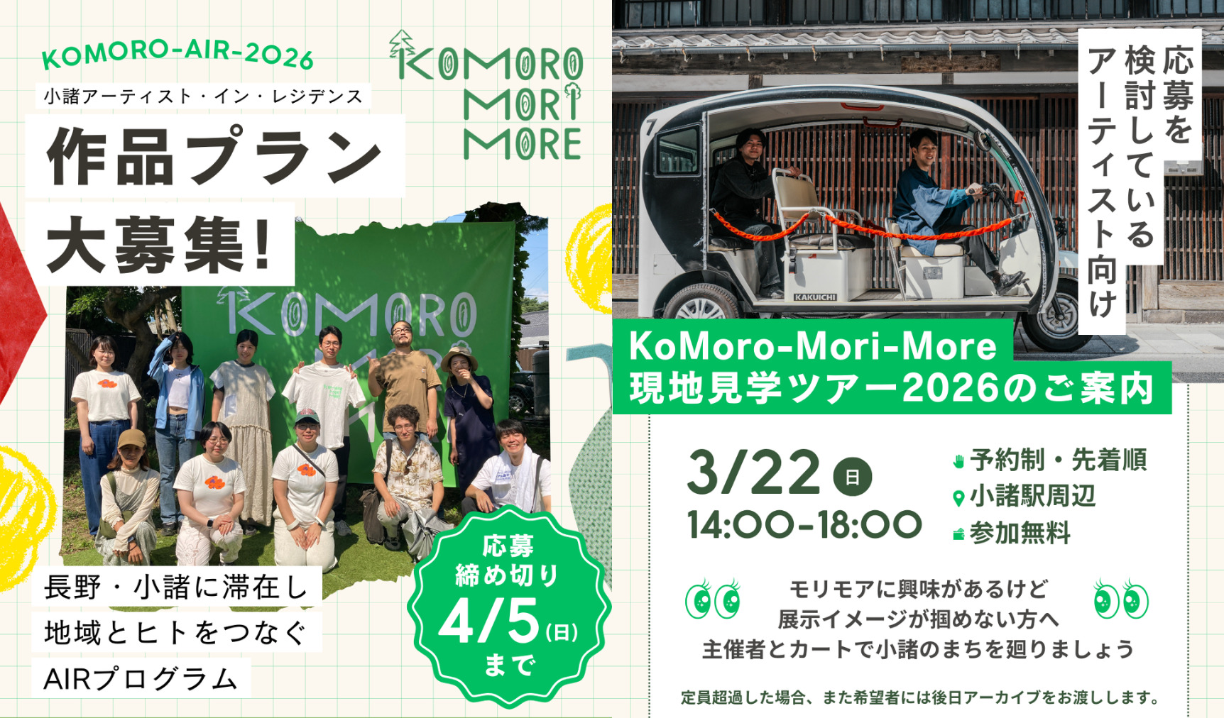 「KoMoro-Mori-More(コモロ・モリ・モア)」は、長野県小諸市で展開するアートプロジェクトです。これまでに5回、小諸市八満の「Cafe & Gallery サロン・ド・ヴェール」を拠点として、また2024年からは小諸駅前にも拡大し、アーティスト・イン・レジデンス形式で実施してきました。